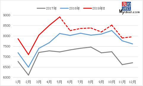 圖3:2017-2019年全國(guó)粗鋼月產(chǎn)量(單位:萬噸)